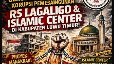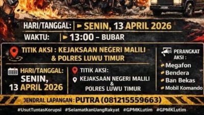 Luwu Timur, 08 April 2026 — Gerakan Pemuda Mahasiswa Keadilan (GPMK) Luwu Timur Bersama Lembaga Analisis Anti Korupsi Indonesia ( LAKINDO PUSAT ) menyatakan sikap tegas dengan rencana aksi turun ke jalan dalam Minggu ini. Aksi ini dilakukan sebagai bentuk penyampaian aspirasi sekaligus protes terhadap dugaan proyek mangkrak pembangunan RS Lagaligo Islamic Center yang dinilai belum menunjukkan progres signifikan.